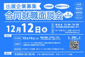 武雄市では12月12日(金)に合同就職面談会を開催するにあたり、出展