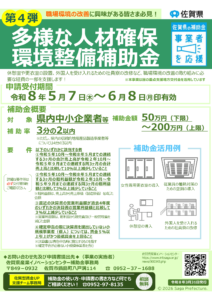 佐賀県では、原材料・エネルギー価格高騰や人材不足等厳しい経営環境の中、県内中小企業者等において意欲ある多様な人材が安心して活躍できるような職場環境の整備を支援することを目的にした補助金の第4弾が発表されました。是非ご活用ください。